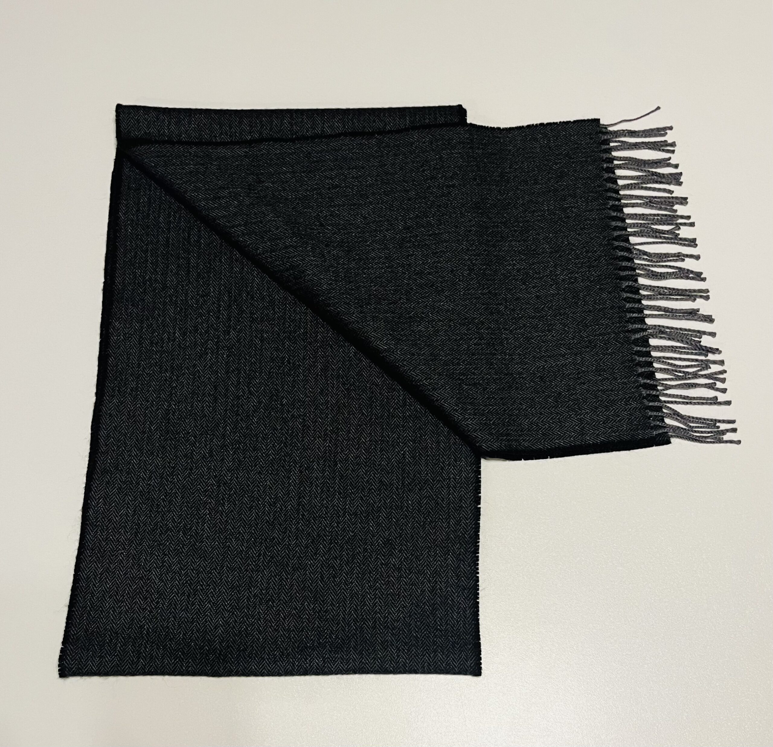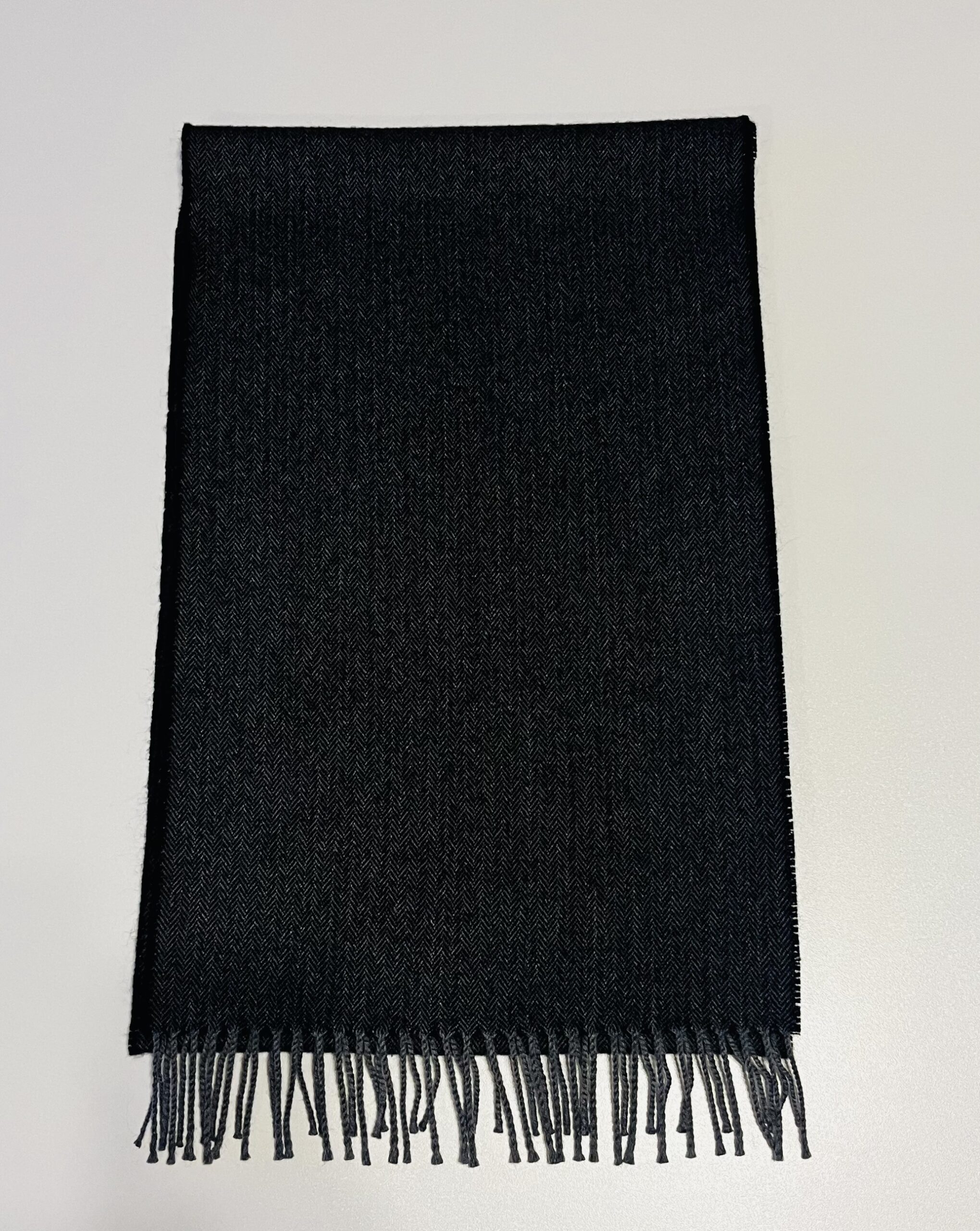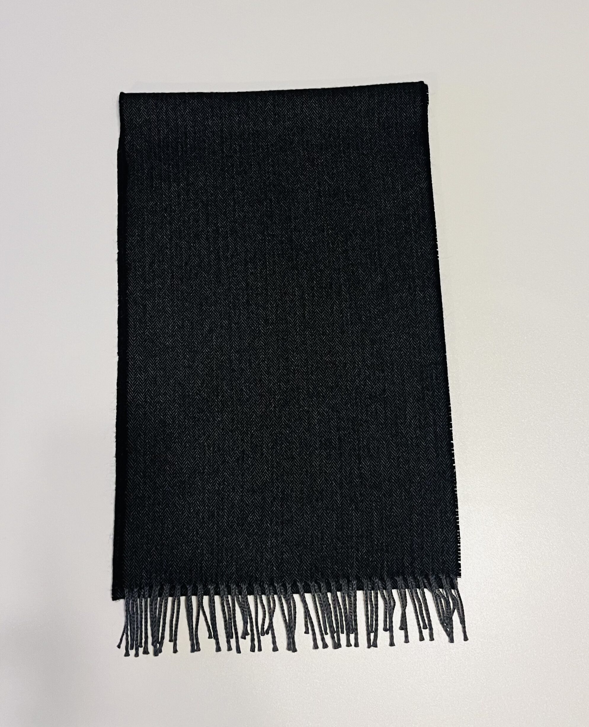 Šalikas pasižymi juodai pilka spalva, kuri lengvai derinama prie įvairių aprangos stilių. Audinio paviršiuje matomas subtilus eglutės (herringbone) raštas, suteikiantis jam rafinuotumo ir prabangos pojūtį. Apačioje esantys tvarkingi, dailūs kutai įneša lengvumo ir žaismingumo.